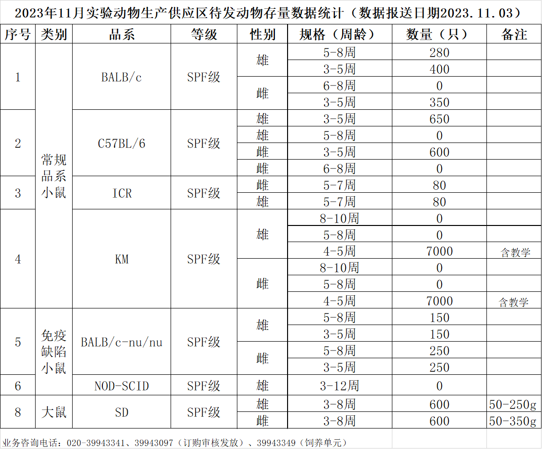 2023年11月实验动物生产供应区待发动物存量数据统计(数据截止日期2023.11.03)