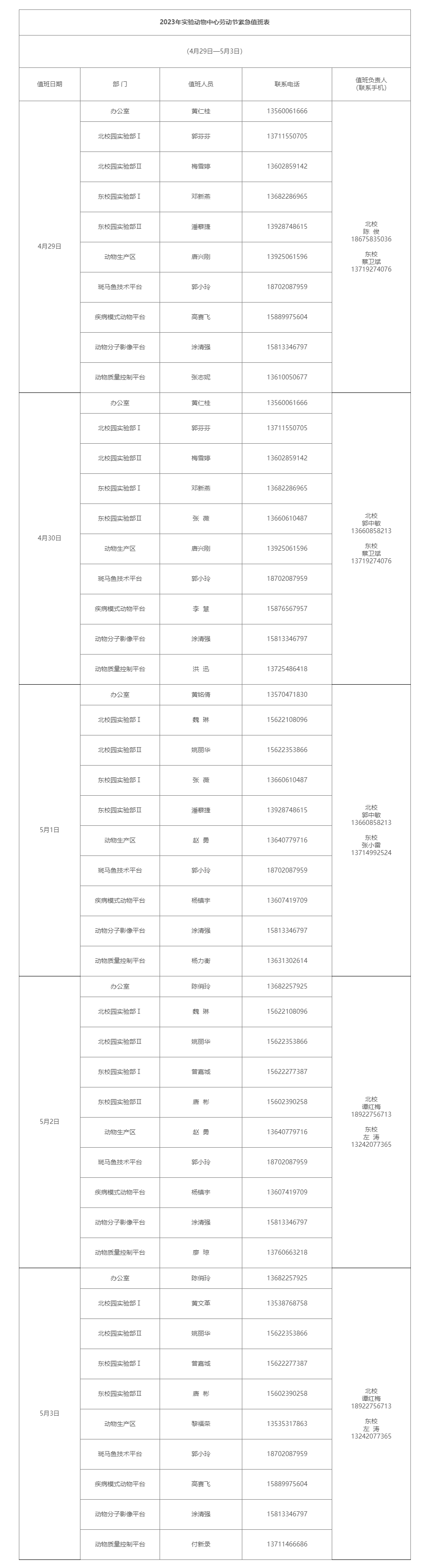 导航痕迹 402永利集团官网实验动物中心 新闻公告 yl23455永利集团 2023年实验动物中心劳动节紧急值班表 扫描此二维码分享 2023年实验动物中心劳动节紧急值班表 发布人:黄铭倩 发布日期:2023-04-28
