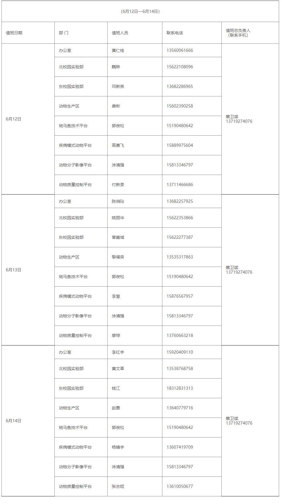 • 2021年实验动物中心端午节紧急值班表