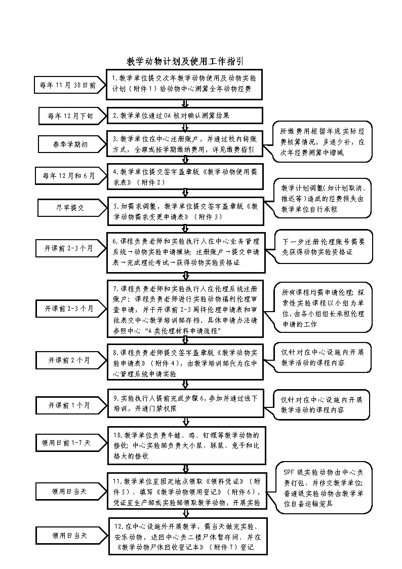 各教学单位应于开学前三个月将签字盖章版《教学动物使用需求表》(附件2)交至中心。中心教学培训部负责收集汇总各单位需求,并按类别分别开展实验动物的采购、繁育,以及动物暂养及实验场地的预约和准备等。