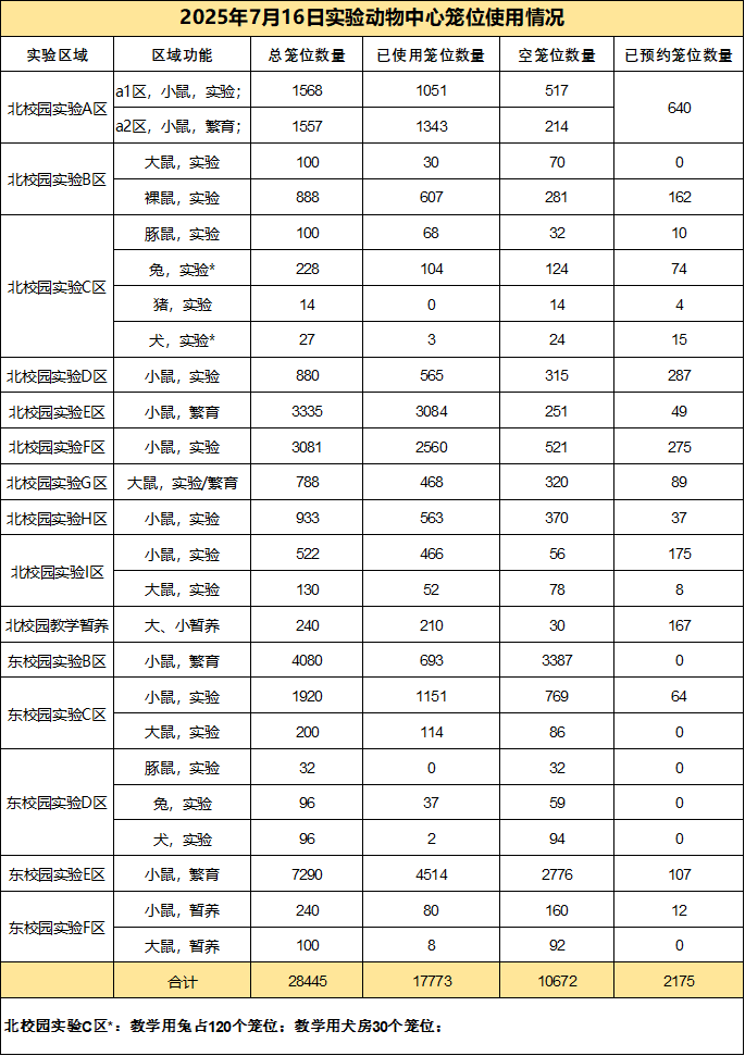 • 2025年7月16日-实验动物中心笼位使用情况