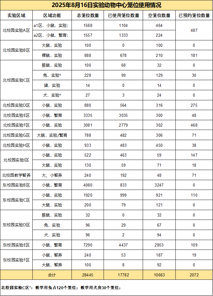 • 2025年8月16日-实验动物中心笼位使用情况